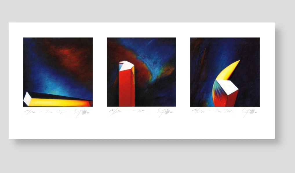 Der Weg - Ist - Das Ziel 3 handcolorierte Original-Serigrafien 2004 gedruckt auf 270g/qm Bütten 49-58-53 Farben Auflage: 160 Papier: 40 x 50 cm (B x H) Motiv: je 29 x 29 cm (B x H) The Journey - Is - The Reward 3 handcoloured screen prints 2004 Printed on 270g/sq.m. Bütten Colours: 49-58-53 Edition: 160 Paper: 16" x 20" (w x h) Motif: 11" x 11" (w x h) |