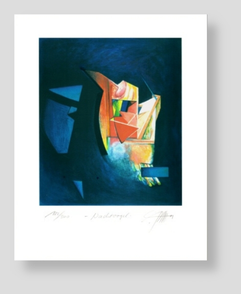 Nachtvogel Original-Serigrafie 2001 gedruckt auf 270g/qm Bütten 52 Farben Auflage: 300 Papier: 30 x 40 cm (B x H) Motiv: 20 x 23,4 cm (B x H) Night Bird Screen print 2001 Printed on 270g/sq.m. Bütten Colours: 52 Edition: 300 Paper: 12" x 16" (w x h) Motif: 7,9" x 9,2" (w x h) |