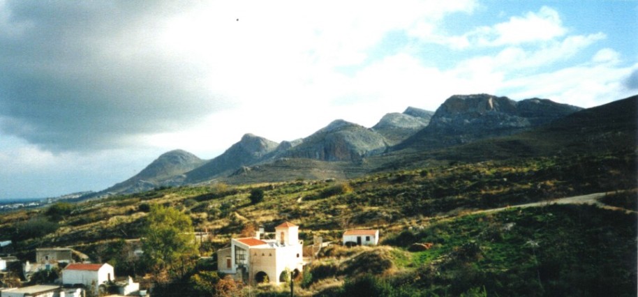 Atelier auf die weißen Katen seines Dorfes, die weit ausladende Messara-Ebene